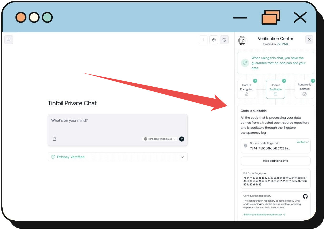Figure 1: Client-side verification center (as seen here on Tinfoil Chat) shows users that their data is encrypted, the code is auditable through Sigstore, and the runtime is isolated in a secure enclave. All verification happens client-side