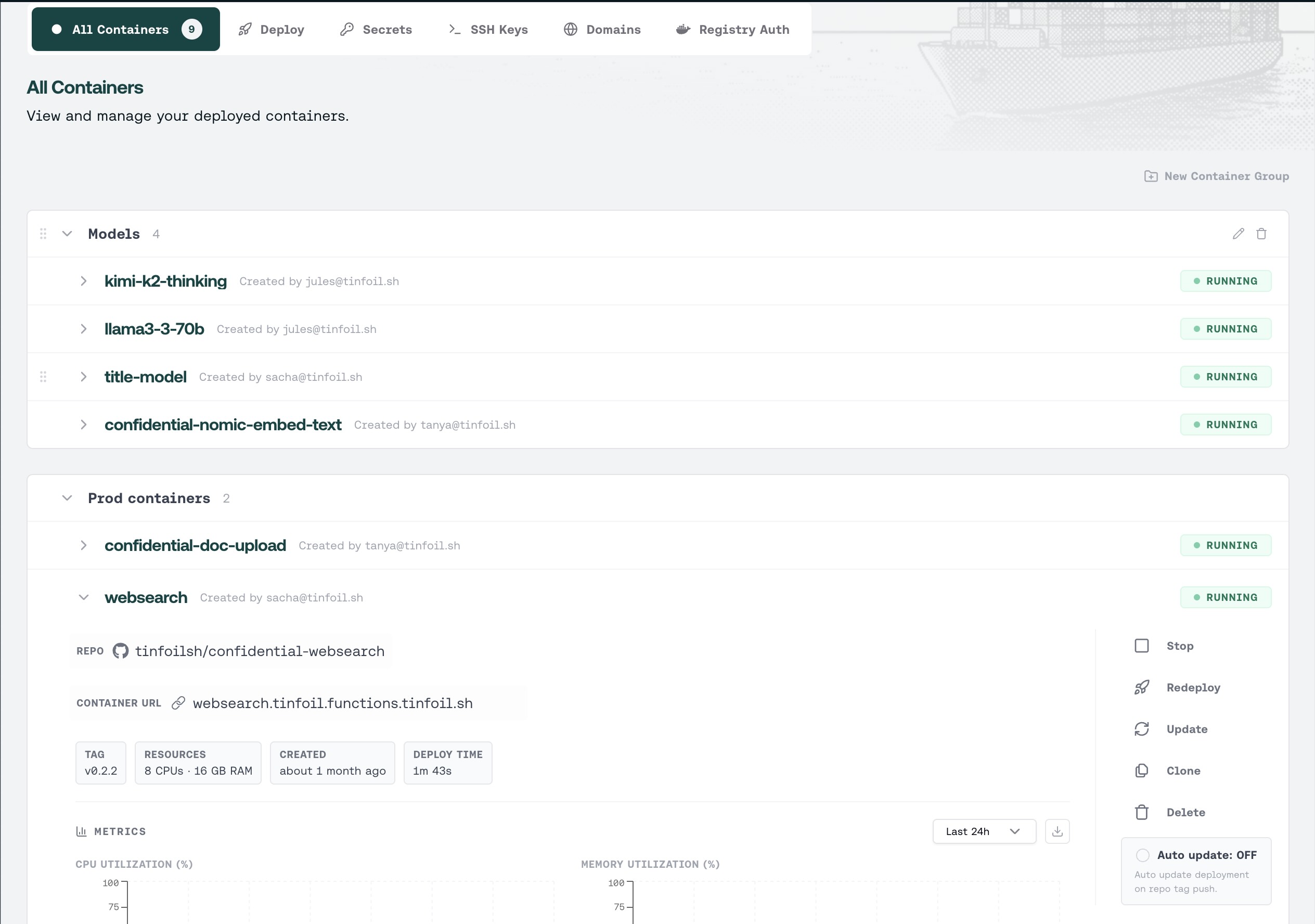 That's why we're launching Tinfoil Containers. Tinfoil Containers lets you deploy any Docker container inside a secure enclave, with the same infrastructure and hardware-backed security guarantees we use for our own inference platform.